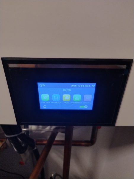 Použité bolo Tepelné čerpadlo GREE – VERSATI III – 8,0/7,0 kW ALL IN ONE. Tento model je vhodný aj pre menšie technické miestnosti, 200l nádrž a hydromodul tvoria jednu vnútornú jednotku, čím sa šetrí priestor. Čerpadlo je vybavené dvojstupňovým rotačným čerpadlom GREE, ktoré efektívne funguje aj pri nízkych teplotách až do -25°C. Pred montážou bola vykonaná aj demontáž elektrického kotla a zásobníka na teplú vodu, ktoré už nefungovali podľa predstáv majiteľa (nadmerná spotreba el. energie). Ovládač čerpadla je na vnútornej jednotke, ktorý zahŕňa ekvitermnu reguláciu, týždenný program, reguláciu podľa referenčnej miestnosti a ďalšie. Nakoľko si majiteľ objednal externý ovládač, ktorý bol umiestnený v referenčnej miestnosti (obývačka) pôvodný bol odpojený. Vzdialené zapnutie a vypnutie je možné cez WIFI ovládanie.