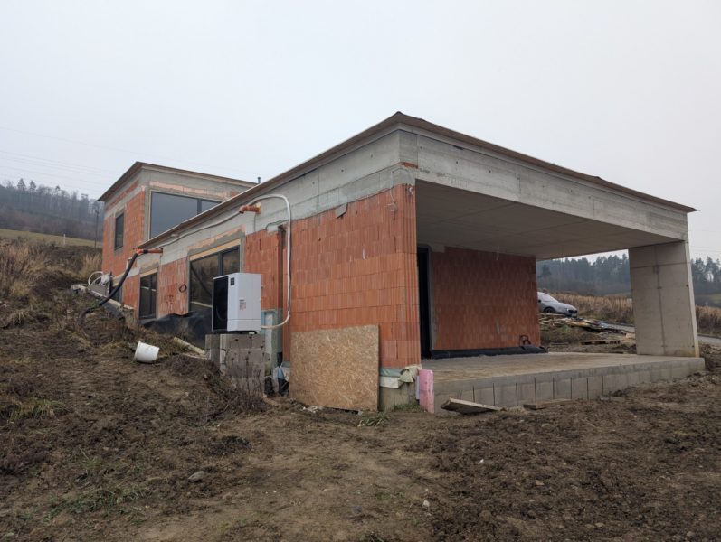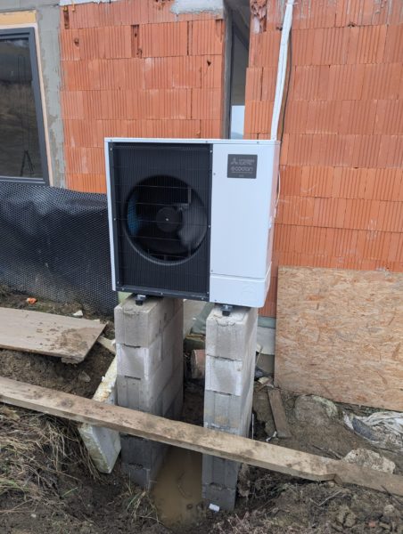 Montáž tepelného čerpadla Mitsubishi Zubadan s výkonom 6 kW do novostavby rodinného domu v obci Stráža. Čerpadlo bude v budúcnosti prepojené na fotovoltiku.